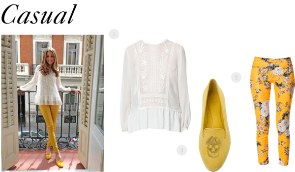 Katie Ermillio gown;from last April's charity event in New York City. A comfortably casual yet chic alternative to the gown is the following ensemble. Here she dons a white embroidered, pleated blouse with yellow pants and yellow loafers. Want more tips on how to wear yellow? Check out